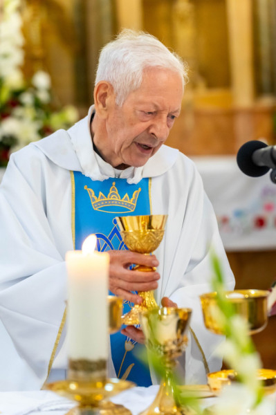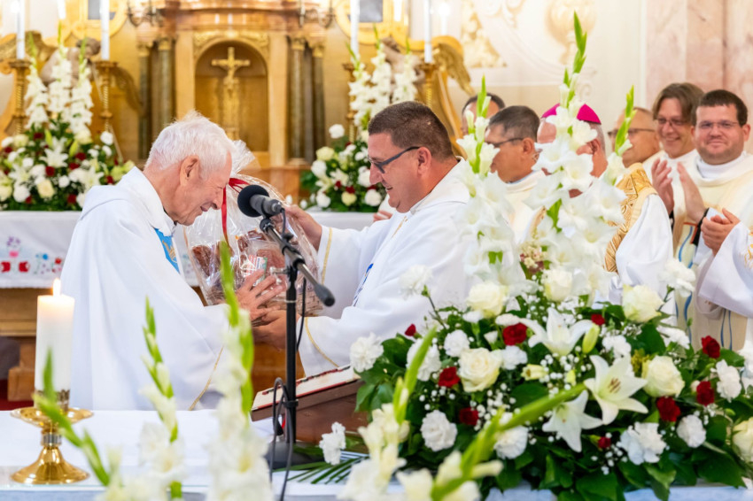 A jubilánst hálával, szeretettel köszöntötte Tódor Szabolcs plébános, megköszönve mindazt a lelki és emberi gazdagságot, amelyet papi szolgálata során közvetített. Felidézte példamutató életét, a nevelésben és képzésben tanúsított igényességét. Köszönetet mondott a közösségért tett fáradhatatlan munkájáért, a közösségi kirándulásokért, a személyes jelenlétért, valamint az idős korában is vállalt élő tanúságtételéért.