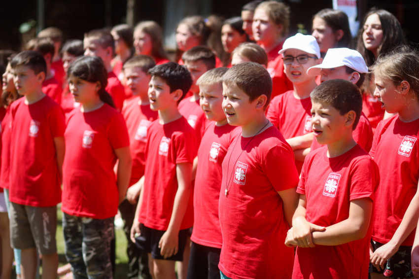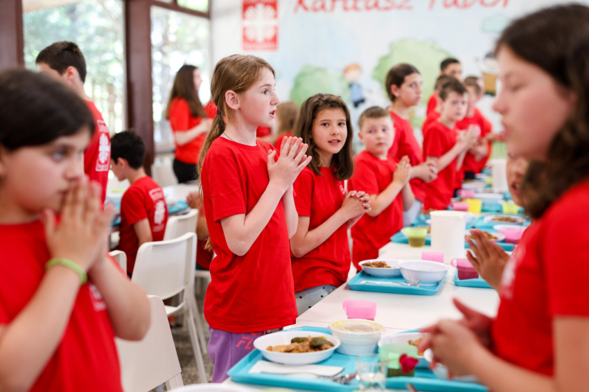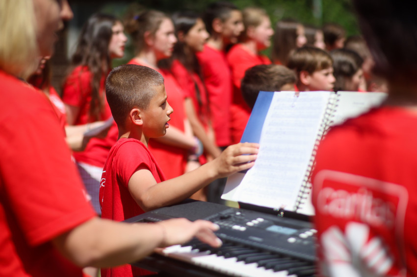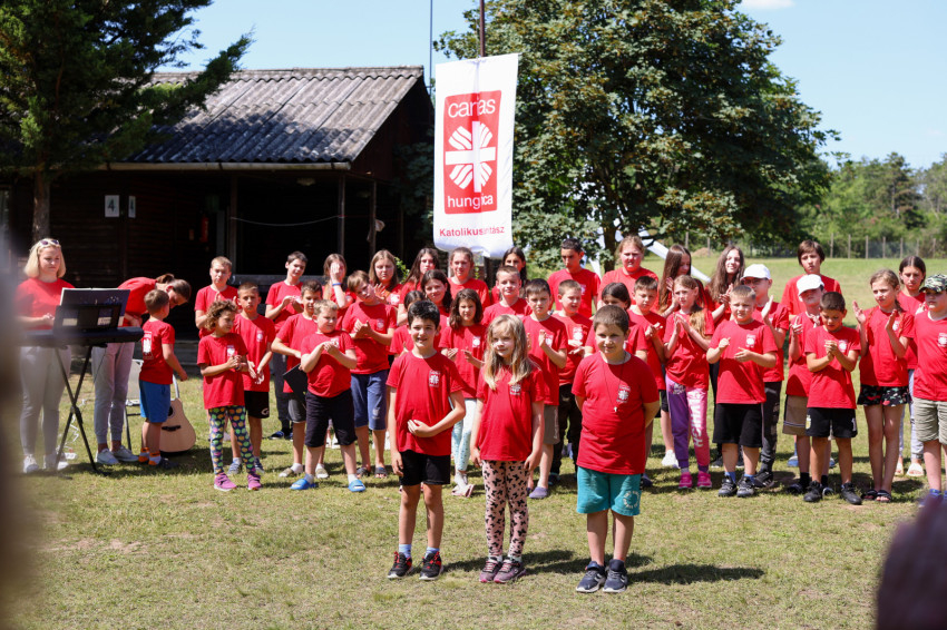 A gyerekek átköltésében csendült fel a jól ismert Ez az a nap kezdetű ének, amelyet köszönetképpen énekeltek el a karitász vezetőinek, munkatársainak, és amelybe belefoglalták az itt szerzett életre szóló élményeiket is: „Ez az a hét, amit itt tölthetünk. Ugráltunk, játszottunk, énekeltünk…”