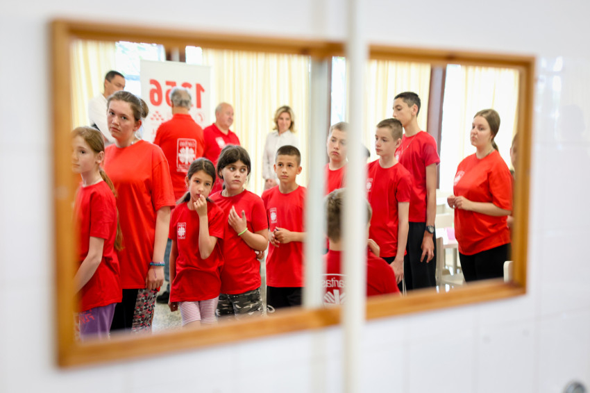 Az ünnepség végén Écsy Gábor minden diáknak kiosztott egy piros karitászkarkötőt, és közös fotók készültek a karitász vezetőivel és képviselőivel.