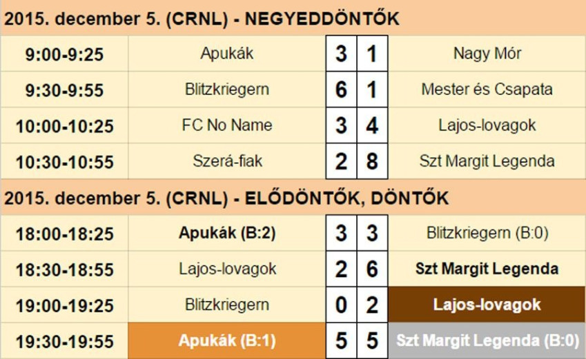 A két selejtező fordulót, ahol a csoportmérkőzések zajlottak, december 5-én a negyeddöntők, majd a döntők zárták. A finálé után eredményhirdetés, majd a már hagyománnyá vált záró agapé várta a résztvevő csapatokat és lelkes szurkolóikat.