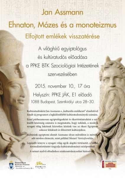„Az egyiptológus Jan Assmann teljesítménye annak kimutatása a szélesebb közönség számára is, hogy nekünk, a modern nyugati világ lakóinak is közvetlen közünk van az ókori Egyiptom sokszor félreértett világához. Saját múltunkba beleszövődik az óegyiptomi kultúra, így a görög-római és a zsidó-keresztény gyökereken kívül – elfelejtett-elfojtott emlékként, egyfajta ellenvilágként és közvetlen előzményként is – ez alkotja kulturális mivoltunk harmadik fontos összetevőjét. Kultúránk egyiptomi elemét Assmann olyan alkotásokban is a rá jellemző szakszerűséggel és eleganciával mutatta ki, mint például Mozart Varázsfuvolája: az erről szóló nagyszabású munkája zenetudományi körökben a mű mértékadó értelmezésének számít. A bibliai monoteizmust időben valamelyest megelőzte Ehnaton fáraó monoteisztikus kísérlete, ezért újra és újra felmerült az a gondolat, hogy a rövid életű Amarna-modell közvetlenül befolyásolta az egyesek szerint egyiptomi származású Mózes vallásalapítását. Az előadás ezeket az összefüggéseket mutatja be és összegzi.” (Radeczky András, a PPKE oktatója összefoglalója)