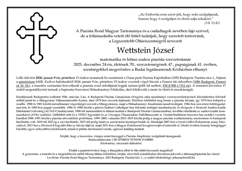 A Legszentebb Oltáriszentségről nevezett Wettstein József piarista szerzetes 2025. december 24-én, életének 70., szerzetességének 47., papságának 41. évében hunyt el szentségekkel megerősítve a Budai Irgalmasrendi Kórházban.