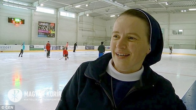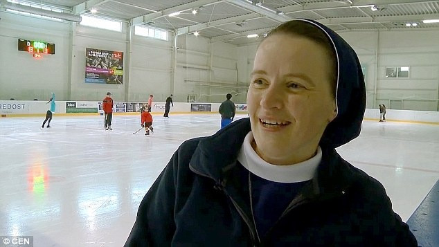 Mária Pavla Hudáčeková orsolyita szerzetesnővér, aki műkorcsolyabajnok volt fiatalabb korában, habitusban mutatta be tudását a pozsonyi jégpályán rendtársainak.