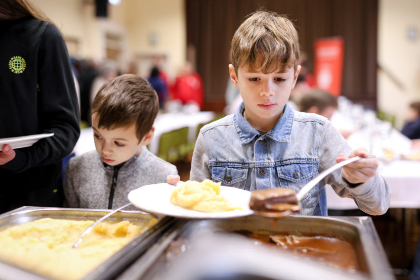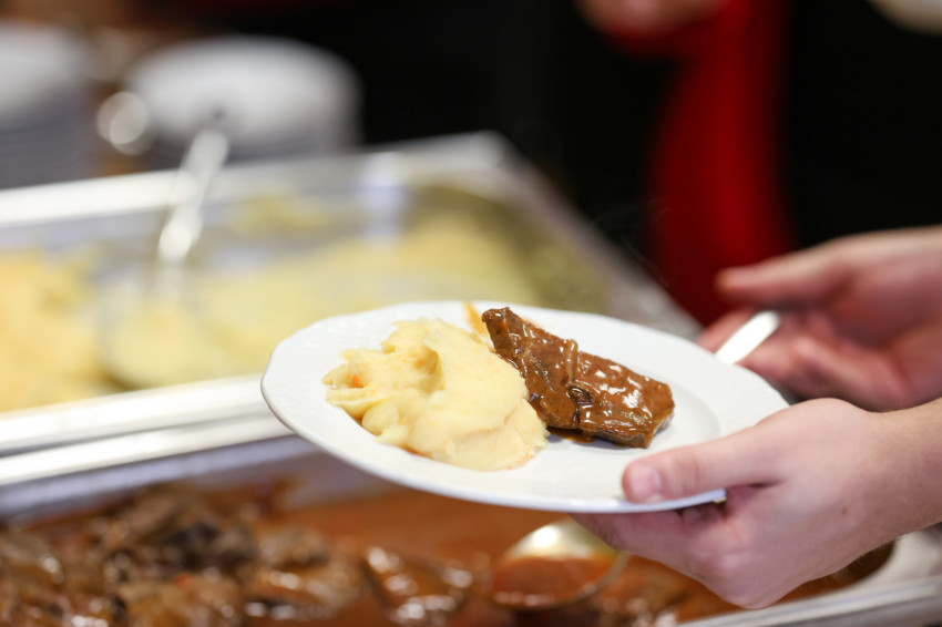 A Szent István termet már előkészítették a vendégek fogadására, az U alakú asztalon szép fehér terítők, a terem végében pedig már ki van készítve az étel, melyet az Esztergom-Budapesti Főegyházmegye finanszírozott. Húsleves, kétféle húsos második fogás és desszert várja a vendégeket.
