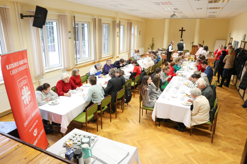 A Szent József-ház kápolnájában köszöntötte a karitászigazgató a meghívottakat, hangsúlyozva a találkozás és a beszélgetés jelentőségét, melyre az ebéd lehetőséget teremt. Biztatta a jelenlevőket, üljenek olyanok mellé, akiket nem ismernek. Közvetítette Erdő Péter bíboros szavait, aki ugyan személyesen nem tud jelen lenni a hagyományteremtő eseményen, de a reggeli szentmisét azokért ajánlotta fel, akik ma itt együtt ünnepelnek.
