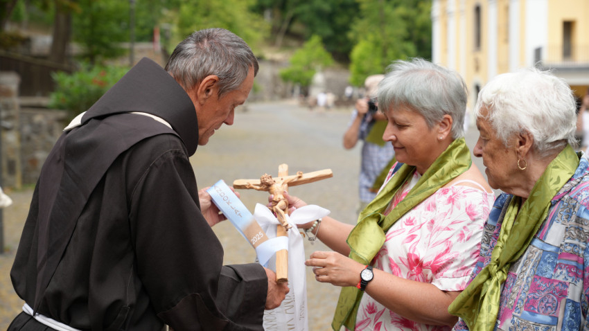 A busszal, személyautóval, illetve gyalogosan is érkező zarándokok különleges ajándékot kaptak Orosz Lóránt OFM kegyhelyigazgatótól, aki külön-külön köszöntötte az érkező csoportokat.