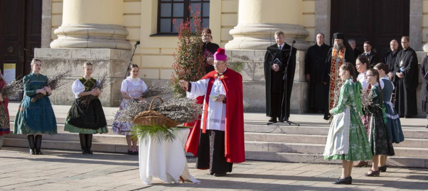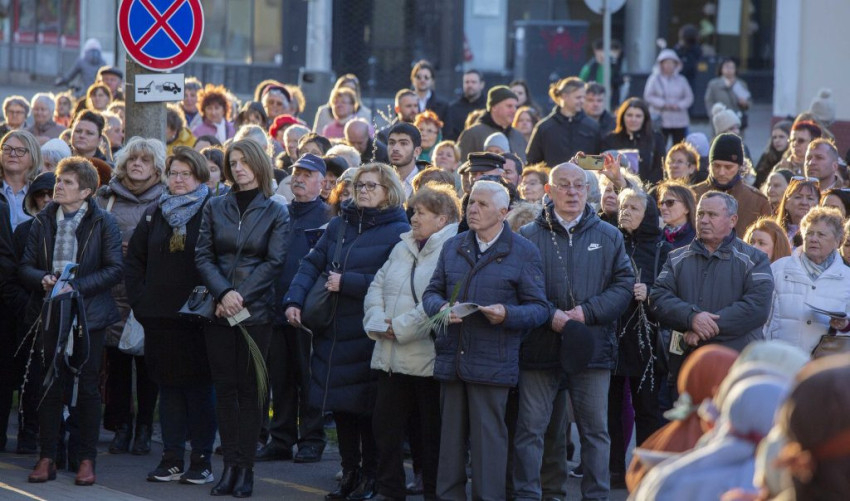 Papp László polgármester házigazdaként köszöntötte a híveket, majd Palánki Ferenc megyéspüspök így fogalmazott: „Nagyböjt kezdete óta a szívünket bűnbánattal és jócselekedetekkel már előkészítettük. Ma azért gyűltünk össze, hogy az egész Egyházzal együtt lélekben előre átéljük Urunk húsvéti misztériumát, vagyis szenvedését és feltámadását. Ő ugyanis ezt a misztériumot akarta beteljesíteni, amikor fölment városába, Jeruzsálembe.