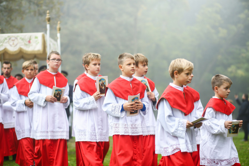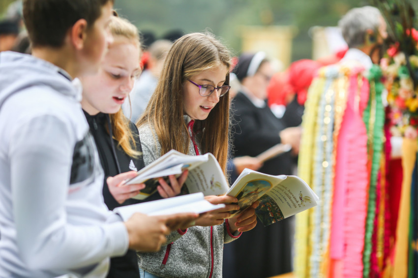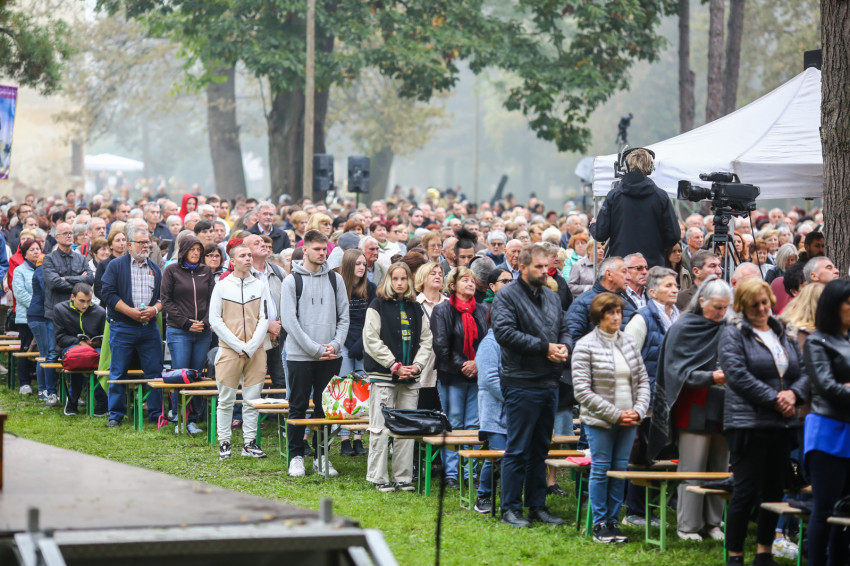 A szabadtéri oltár előtt felállított padokat sorban foglalják el az érkezők, az a több ezer katolikus, akik a környező településekről érkeztek. Magyarok Szlovéniából és Magyarországról, horvátok Horvátországból és Magyarországról, szlovének helyből és több magyarországi településről.
