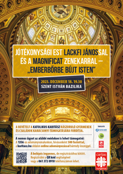 A budapesti Szent István-bazilikában december 18-án, hétfőn 19.30-kor kezdődő jótékonysági est bevételét a Katolikus Karitász rászoruló gyermekek és családok karácsonyi támogatására fordítja.