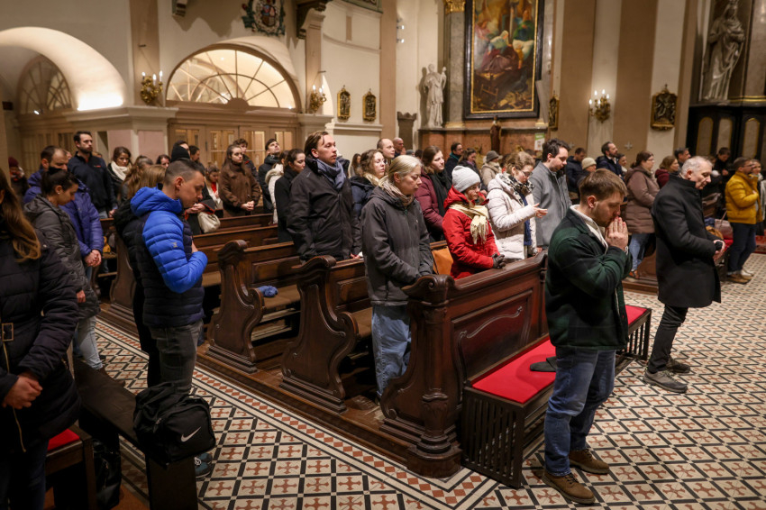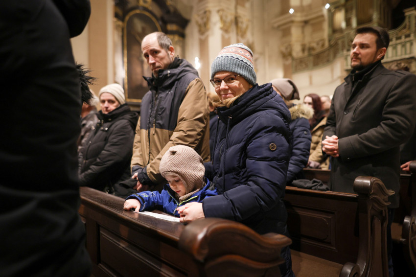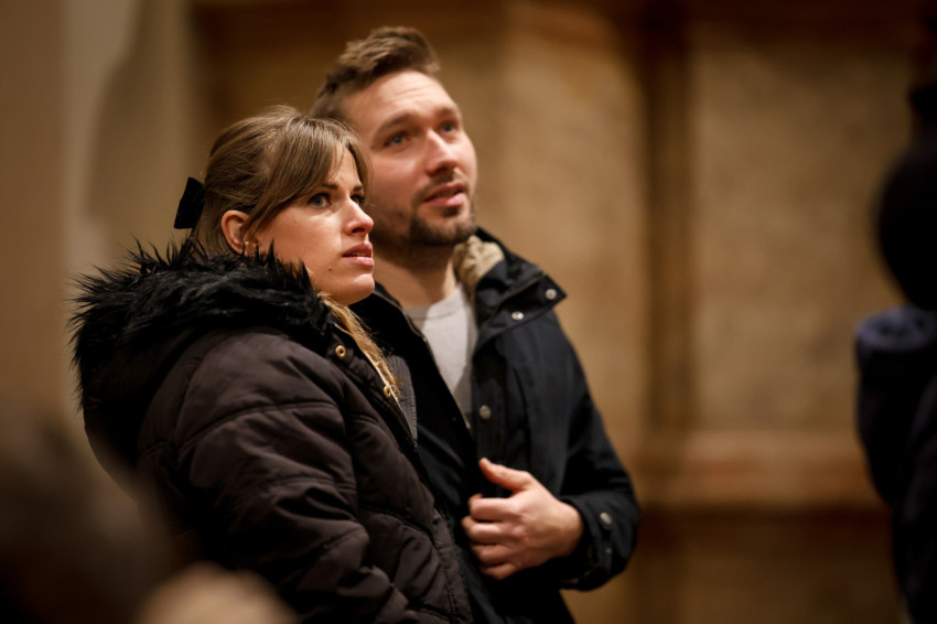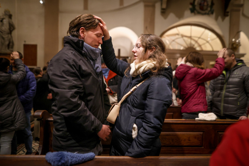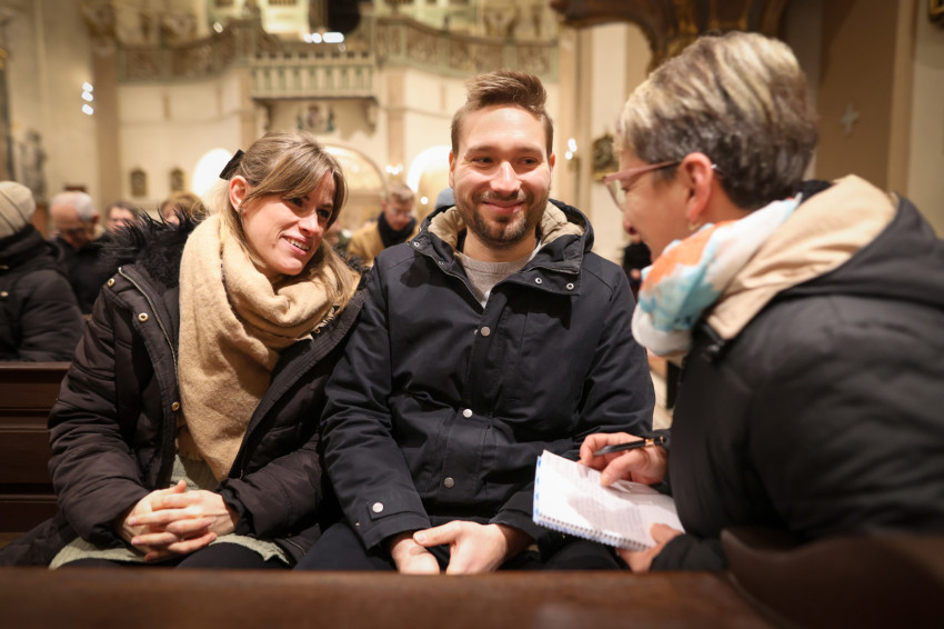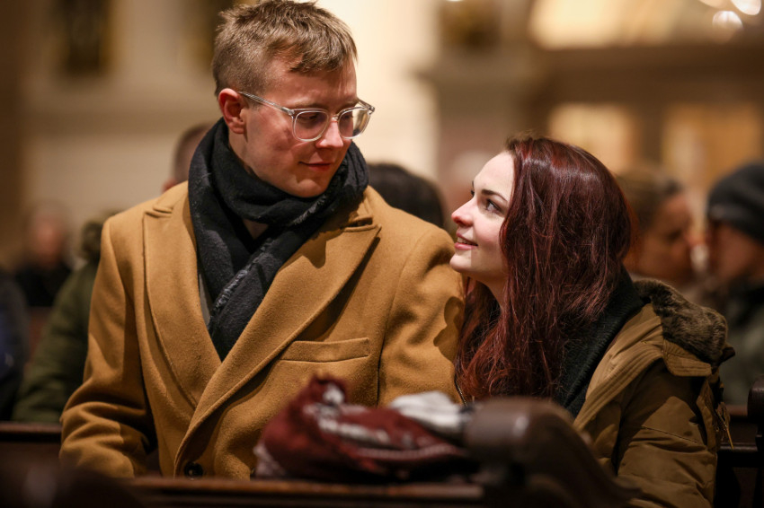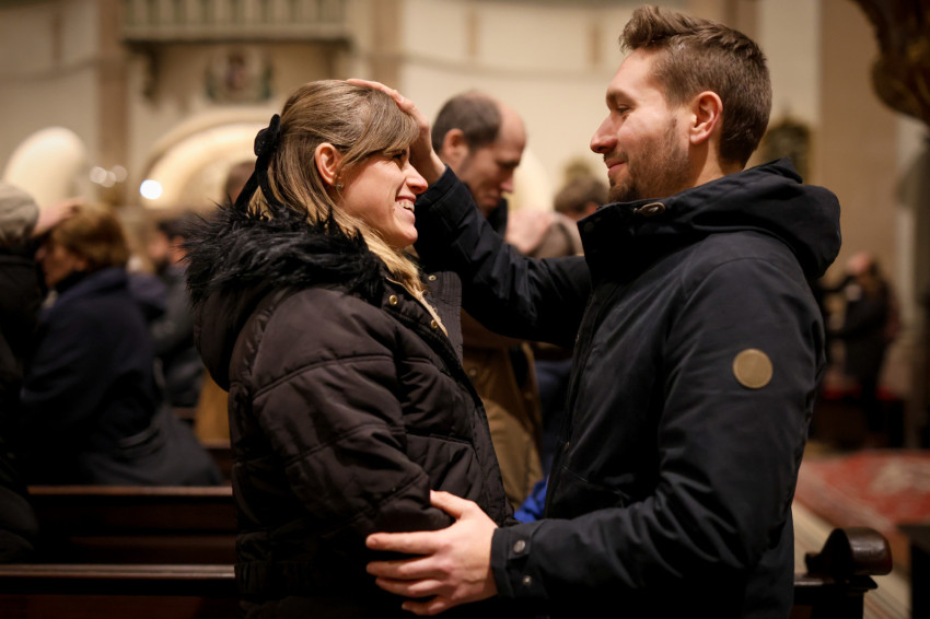 Rozi és Bernát tiszta tekintetű, mosolygós szemű fiatal pár – öröm rájuk nézni, sugárzik róluk, hogy boldogok. Negyedik gyermeküket várván – két kislányuk és a kisfiuk után újra kislány érkezik a családba – külön szervezést igényelt, hogy időben elinduljanak és meg is érkezzenek. Kilenc éve ismerik egymást, házasságuk hetedik évében vannak. Abban a bizonyos, sokak szerint a párkapcsolatokban vízválasztónak számító, krízishelyzeteket hozó hetedik évben. „Harmadszor veszünk részt ezen a szentmisén. Ma azért is jöttünk el, hogy egy kicsit kettesben lehessünk és külön áldásban is részesüljünk, hogy így az előttünk álló esetleges nehézségeket könnyebben átvészelhessük – mondja Rozi. „Korábban is ide, a Margit körúti templomba jártunk az esti fél nyolcas misére, de amióta néhány éve kiköltöztünk az agglomerációba, ritkábban jutunk el. De ma mindenképpen szerettünk volna eljönni”– mondja Bernát.