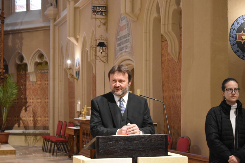 Ha valamit építeni akarunk, elgondolkodunk, mekkora legyen – kezdte szentbeszédét Veres András –, ha nagyot akarunk, erős, mély alapról kell gondoskodnunk. Gondoljunk a bibliai példabeszédre a sziklára és homokra épült házról. Jézus azt ajánlotta, lelki értelemben is így tegyünk: