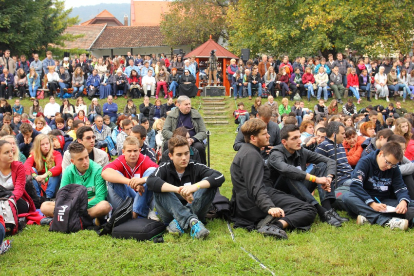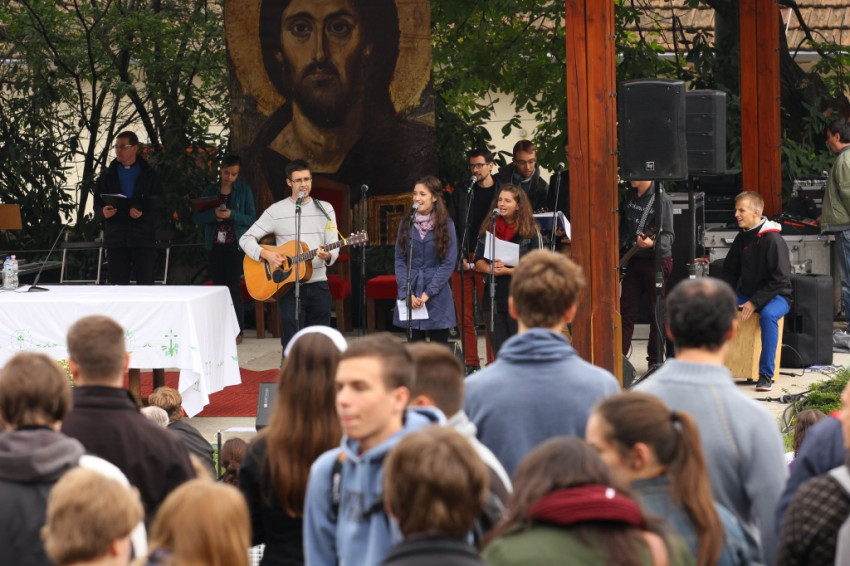 A Nagymarosi Ifjúsági Találkozót a hagyományokhoz híven közös reggeli ima nyitotta meg. Idén az áhítatot Sillye Gábor vezetésével a káposztásmegyeri Szentháromság-plébánia ifjú zenészei és énekesei tartották. A közös éneklést követően Dobszay Márton Benedek ferences tartományfőnök röviden ismertette a nap mottóját: „Engedelmeskedjetek egymásnak!” (Ef 5,21). A jelmondat a megszentelt élet évéhez kapcsolódó gondolati ívbe illeszkedik: idén májusban a szegénység volt a téma, jövő tavasszal pedig a tisztaság tematikájával foglalkoznak majd. A tartományfőnök azt is elmondta, hogy a szegénység, az engedelmesség és a tisztaság három olyan – kiemelten a szerzeteseknek szóló – jézusi tanács, amely mindenkit a szeretet útjára vezet. Arra hívta a fiatalokat és az idősebb korosztályokat is, hogy a nap folyamán engedelmeskedjenek az adott pillanatnak, hiszen az engedelmességet a jelen megélésével lehet a legjobban gyakorolni.