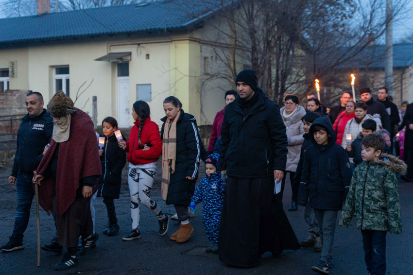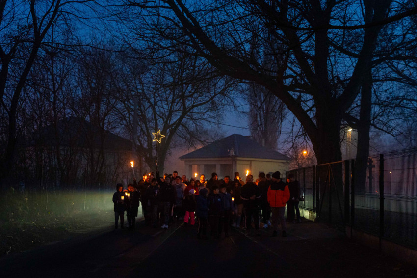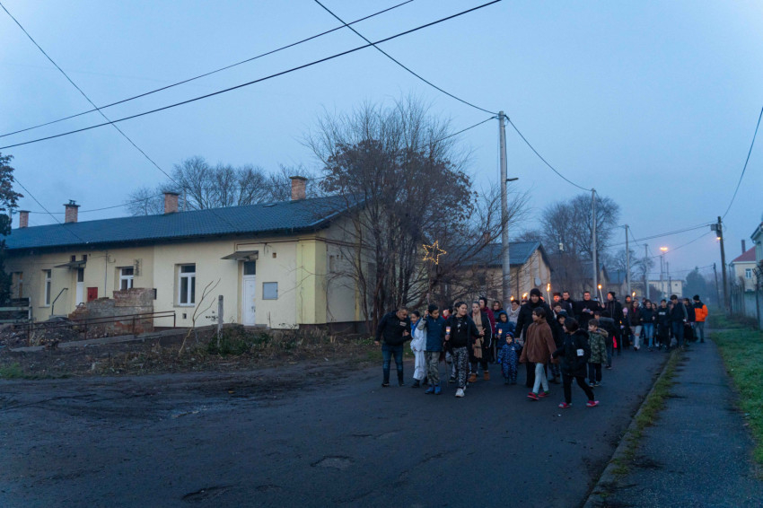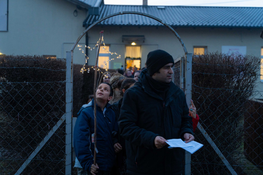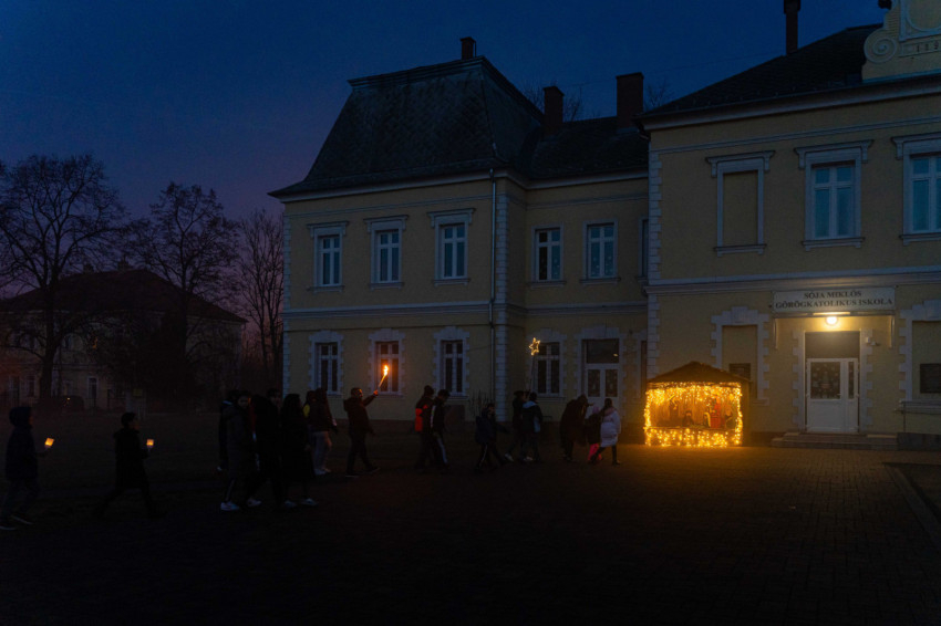 A kántálók, akik között voltak az iskolában tanító pedagógusok és szülők is, a Huszártelepen található Sója Miklós Görögkatolikus Általános Iskoláig sétált, ahol az udvaron felállított betlehem hívogatta fényesen az embereket.