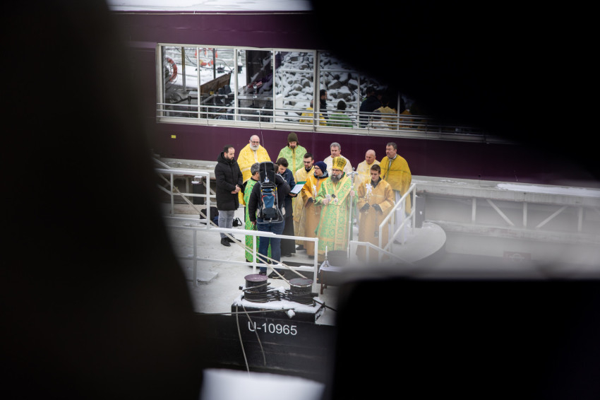 A Batthyány térnél a papság és az asszisztencia Kocsis Fülöp érsek-metropolita vezetésével a Dunára helyezett mólón sorakozott fel a vízszentelés szertartásán.