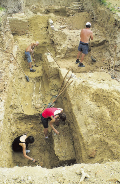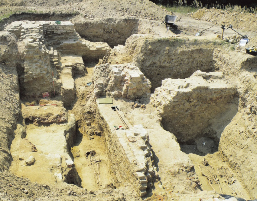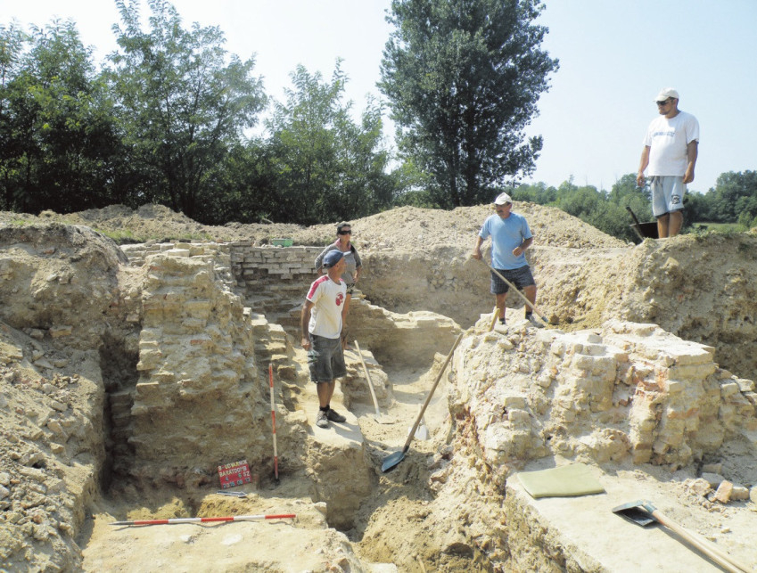 – Egy másik alapfal 3,5-4 méterre keletre volt. Agyagba helyezett téglasorokkal alapozták. Elképzelhető, hogy valamilyen támfal vagy kerítőfal állt itt, de a legvalószínűbb, hogy a prépostsági épületekhez tartozott – véli Molnár István. – Az északnyugati sarkát és a nyugati falának egy szakaszát bontottuk ki. A sekrestye délkeleti sarkától 6 és fél méterre indult. A fal mellett az alapárkot tégladarabokkal töltötték fel, és úgy látszik, a helyiség belsejét is megalapozták. Az épület nem párhuzamos a többi fallal, az alapozás szerkezete sem hasonlít a többire. A sekrestye déli falától 15 és fél méterre délre egy magasan induló, habarcs nélkül földbe tett tégladarabokból készült alapozást találtunk, amely biztosan a késői időszakban épült. Ekkor a járószint már jóval magasabban volt. Lehetett ez valamilyen kerítőfal vagy egy elég gyengén megépített épület része, de ezt is beásások, sírok rombolták.