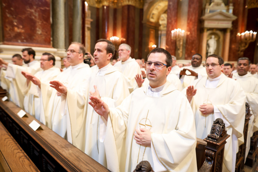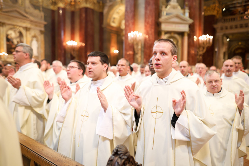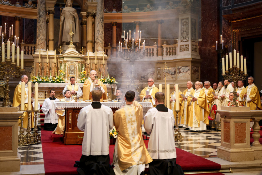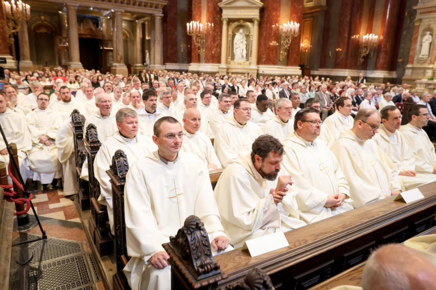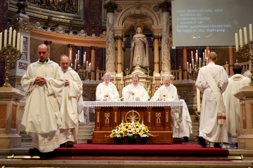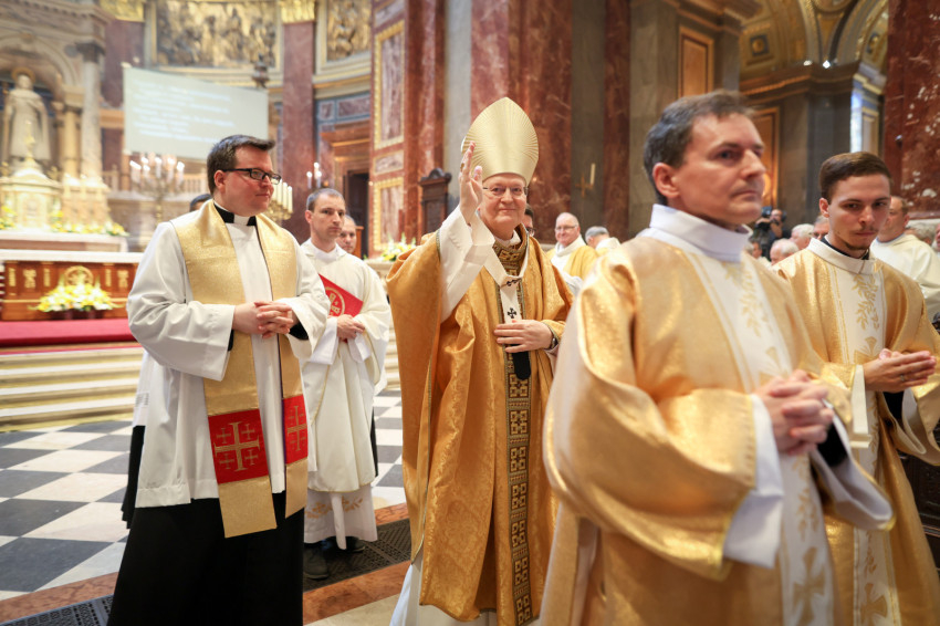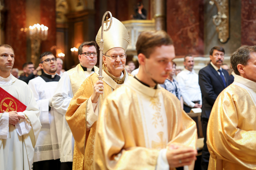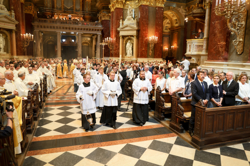 A bevonuló menetben Erdő Péter bíboros mellett voltak püspöktársai, az Esztergom-Budapesti Főegyházmegye papjai, papnövendékei, állandó diakónusok.