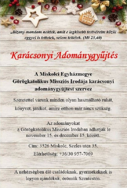 Az adományokat november 15. és december 15. között lehet leadni a Görögkatolikus Missziós Irodában (3526 Miskolc, Szeles utca 35., telefon: +36/30 9577069).