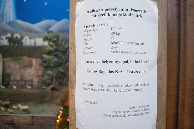 – A fél egyes mise után kiürítettük a perselyt, így a tolvajok üres kézzel távoztak. Munkatársaim a délutáni mise kezdetekor már csak a szekrény hűlt helyét találták – mondta Kondé Lajos. A plébános a persely egykori helye mögötti oszlopra egy feliratot ragasztott ki, amiben a pénztartó főbb paraméterei mellett a tolvajokat is megszólította. „Kedves ragadós kezű testvéreink! Sajnáljuk, hogy csalódást okoztunk nektek, hiszen üres persellyel kellett dolgoznotok" – olvasható a papíron.