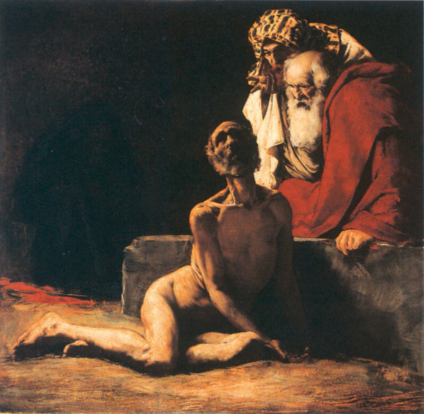 A festményen azt a jelenetet láthatjuk, amikor Jób mindenét elveszítve teljes meztelenségében és kiszolgáltatottságában a földön hever, miközben barátai tanácsokkal látják el. Jób a meg nem értettség és magány kínjait átélve Istenhez kiált, és kitart saját igaz volta mellett – amelyet végül maga Isten fogad el, bár szembesíti Jóbot azzal, hogy csak a Teremtő lehet mindenek tudója, és minden élet hozzá tartozik.