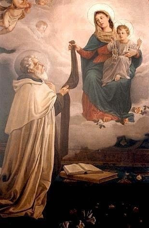 Stock Szent Simon 1251. július 16-án részesült a skapuláré látomásában. A hagyomány szerint a Szűzanya angyalok és szentek kíséretében jelent meg a rendfőnöknek, és átnyújtotta neki a skapuláré nevű vállruhát azzal az ígérettel, hogy aki viseli, nem jut a pokolba, és a halálát követő szombaton kiszabadul a tisztítótűzből. E kiváltságot később a rendtagokon kívül kiterjesztették minden hívőre, aki a skapulárét, illetve annak éremváltozatát viseli és a Kármelhegyi Boldogasszony oltalma alatt a megfelelő életmódra vállalkozik.