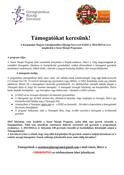 Fejezzük ki összetartásunkat, szolidaritásunkat ne csak szavakkal, de tettekkel is! Segítsünk mi is, hogy méltóbb módon tudjon tanulni egy nehéz sorsú magyar gyermek! Havi 4000 forint nem nagy összeg, nekik viszont jelentős segítség – olvasható a Szent Margit Porgram kiírásában.