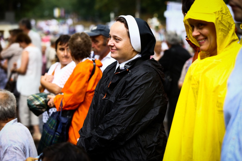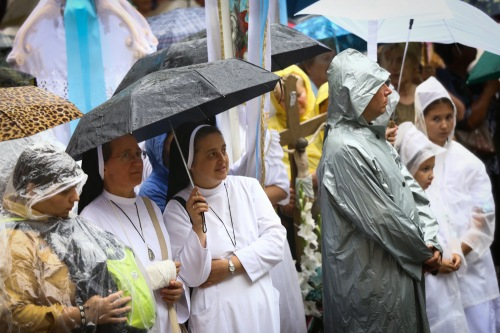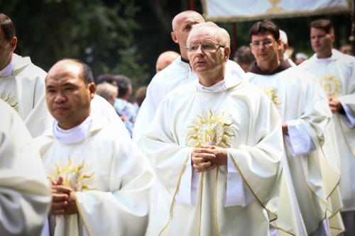 A sűrűn zuhogó esőben kezdődő ünnepi liturgia a Mária-szobrok hordozóinak bevonulásával indult. A szentmisét latinul mutatta be Kazimierz Nycz bíboros az ünnepen megjelent számos paptestvérrel.