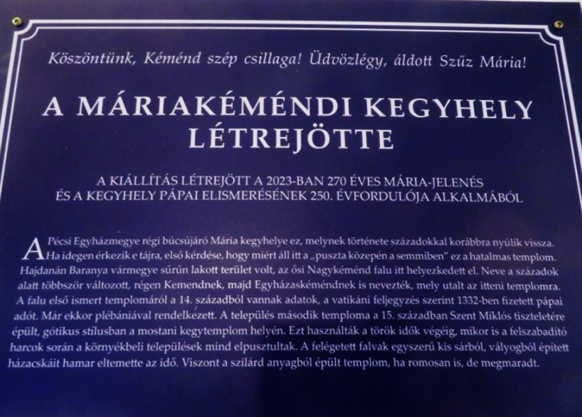 De mit is láthatunk a máriakéméndi kegyhelytörténeti múzeumban? A kiállítás a kegyhely történetét mutatja be tablókon a kezdetektől napjainkig. A teremben elhelyezett tárgyaknak mintegy fele a kegyhely tulajdona, a többi Biki Endre Gábor magántulajdonából, illetve magánszemélyek adományaiból került a múzeumba. Még Németországból is küldtek régi tárgyakat és könyveket.