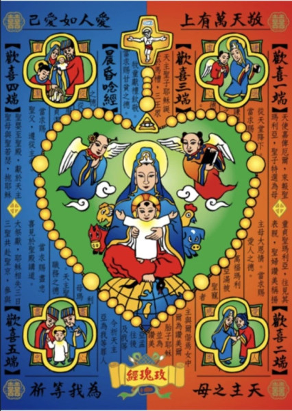 Egy másik alkotás keleti stílusban ábrázolja Szűz Máriát, akit a rózsafüzér örvendetes titkainak jelenetei vesznek körül. A szentírási versek is szerepelnek a műalkotásban, kínai karakterekkel.