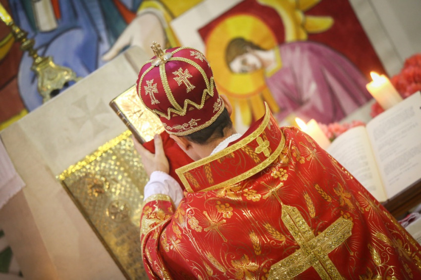 Ma nem sírni gyűltünk össze – hangsúlyozta Krikor Badichah. Elmondta, előző nap tanakodtak, milyen színű ruhában legyen a pap a mai szentmisén – és a vörös mellett döntöttek, amely az öröm színe is, hiszen az örmény vértanúkat szentté avatták, ne sirassuk már őket, akik a mennyben vannak. Legyetek örmények hittel, ne csak szívvel és lélekkel! – szólította fel a híveket a celebráns. Ezután kiemelte a vértanú püspök, Mikajel Hacsadurján példáját, akit börtönbe zártak, megkínoztak, mellkasán tüzet raktak, a saját mellkeresztjének láncával próbálták megfojtani, végül feldarabolták – az ilyen emberek nem halnak meg, emlékezünk rájuk és imádkozunk értük, de ők is imádkoznak értünk, hiszen a mennyben vannak.