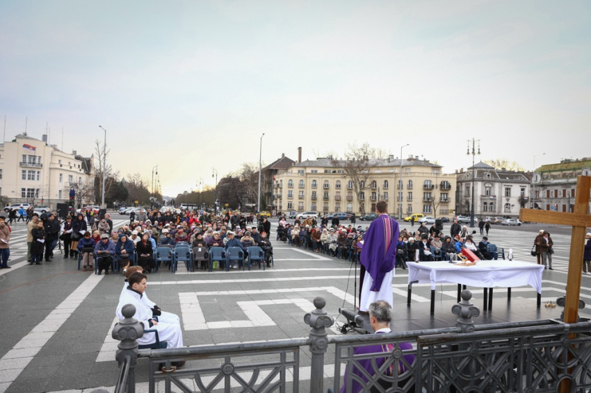 Azért jöttünk ide, hogy keressük Jézust – kezdte szentbeszédét Fejéregyházi Tamás, a Krisztus Légiója Kongregáció elöljárója a Keresztút az életért zarándoklat szentmiséjén. – A zarándoklat mottója egy paradoxont fejez ki: a halálába kísérjük Jézust, de ez az út az élet útja. Jövőt és reményt ad nekünk Jézus, aki az élet istene, akit keresni jöttünk. Az értünk szenvedő Krisztusra emlékezünk, és nem nyugodhatunk meg abban, hogy ezt a golgotát „happy end” zárja.