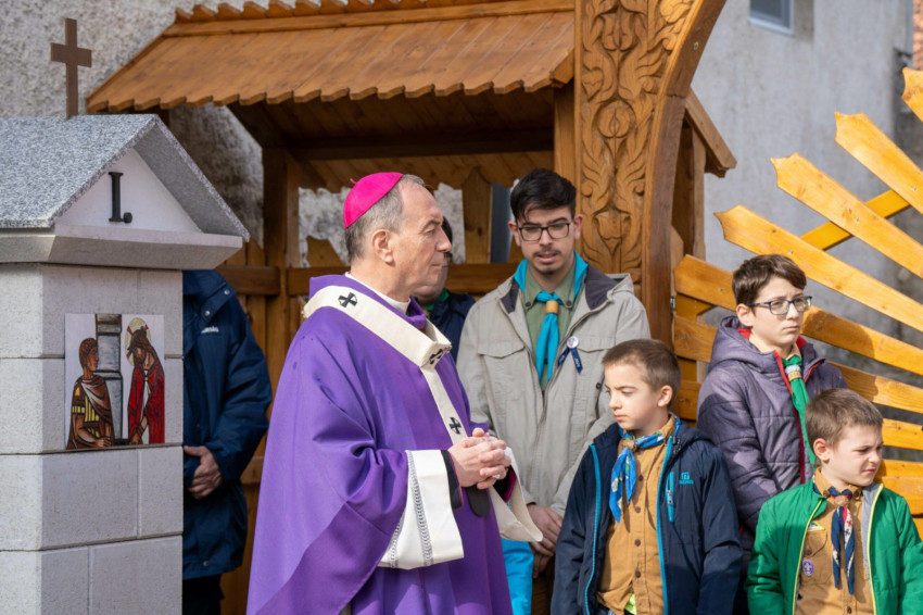 A főpásztor a szentmisét követően megáldotta a keresztutat, annak első állomásánál.