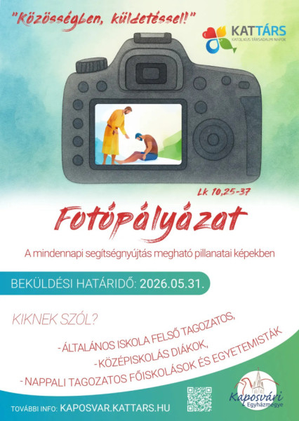 A Kaposvári Egyházmegye Testvériesebb és igazságosabb világot! címmel fotópályázatot hirdet határokon innen és túl katolikus hit- és erkölcstanra, katolikus fakultatív hittanra, valamint katolikus egyházi fenntartású intézményekben katolikus hittanra járó általános és középiskolás diákoknak, nappali képzésen részt vevő főiskolai és egyetemi hallgatóknak.