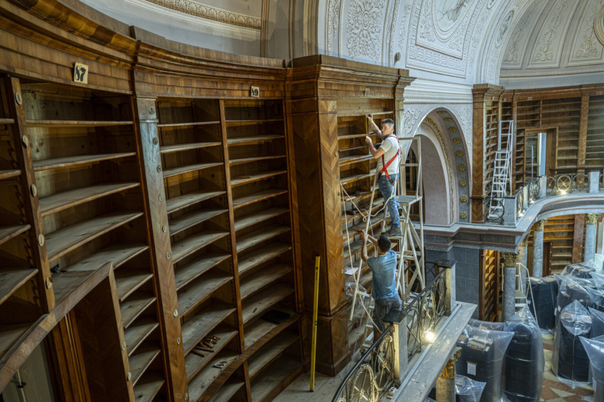 Itt az idő kijavítani, nosza elő a tervrajzokkal! Ám amíg az épület szerkezetéről maradtak fenn eredeti tervek, a belsőépítészeti megoldásokról, a polcrendszerről szinte semmi. Egy kiváló asztalosnak azonban ez nem akkora gond, mert akármilyen hihetetlenül is hangzik, a bútorzatépítési technológiák alig változtak. Eltelt kétszáz év, de a technika nincs annyira távol. Ránéznek, és látják, hogy polcbeakasztásos, fogasléces megoldásokat alkalmaztak, swartnitot és furnérozást, amiket manapság már nem pontosan így használnak, de tisztában vannak a kivitelezésével.