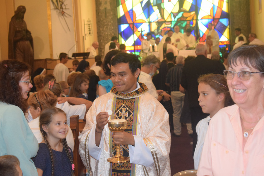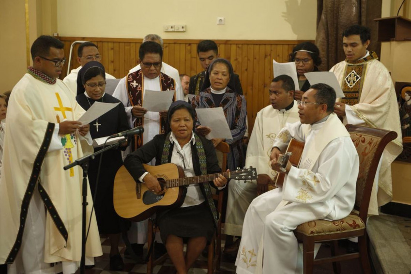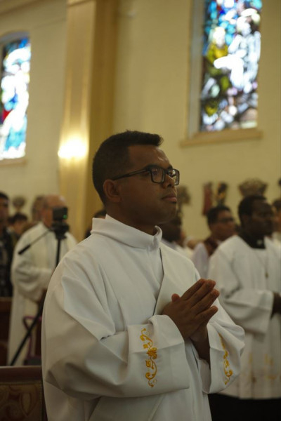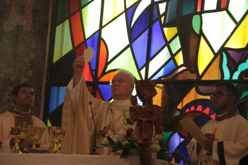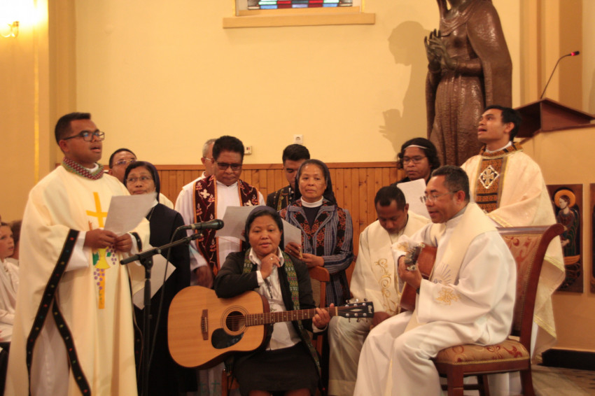 Innentől az újonnan szenteltek is részt vettek a szentmisén a koncelebrálásban. Az áldozás után gitáros énekek hangoztak el, köztük egy indonéz népének is felcsendült.