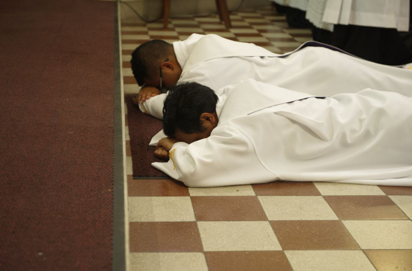 Ezután a két szentelendő arcra borulva, a többi jelenlévő térdelve énekelte el a Mindenszentek litániáját.