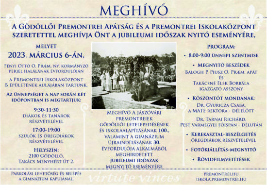 Március 6: A jubileumi időszak megnyitója Fényi Ottó egykori kormányzó perjel halálának évfordulóján. Délelőtt a jelenlegi diákok számára szerveznek műsort, a délutáni, azonos tartalmú ünnepségre a szülőket és az egykori diákokat várják.