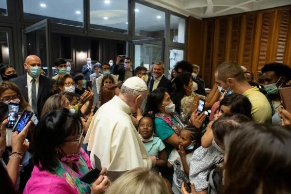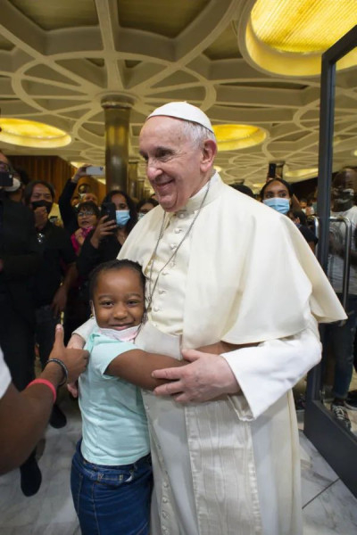 A Matteo Bruni által kiadott közlemény szerint a vetítés végén érkezett meg Ferenc pápa a VI. Pál terem átriumába, ahol elbeszélgetett a jelenlévőkkel, akik között volt húsz olyan menekült is, akik az elmúlt hetekben érkeztek Afganisztánból – a pápa szeretetteli és vigasztaló szavakkal fordult hozzájuk.