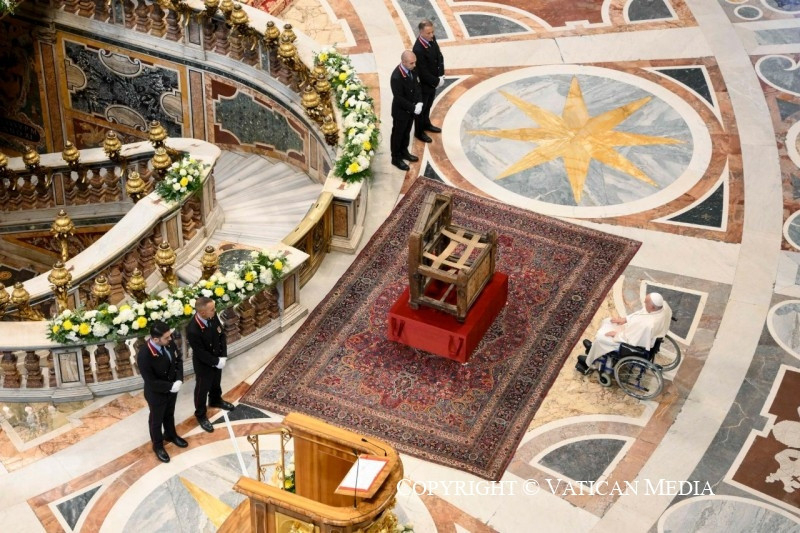 „Visszavezet minket ahhoz a légkörhöz, amely az első keresztény közösségben uralkodott – tette hozzá a bíboros. – Péter széke arról beszél nekünk, hogy összegyűlünk a hívek közösségében, az Egyház a pásztora körül gyűlik egybe, ahol mindenki személyes meghívást kap Jézus követésére, egy olyan útra, amely ugyanakkor soha nem individualista, hanem közös út, amelyet a testvérek világítanak meg.”