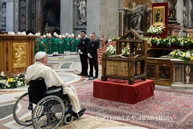 Ferenc pápa Mauro Gambetti bíborossal, a bazilika főpapjával együtt közelről szemügyre vette az antik trónszéket a Szent Péter-bazilika Ottoboni-sekrestyéjében október 2-án, a XVI. rendes püspöki szinódus második ülésszakának nyitó szentmiséje előtt. A Szentatya ezután úgy rendelkezett, hogy a szinódus befejezésekor tegyék közszemlére, hogy mindenki megcsodálhassa.