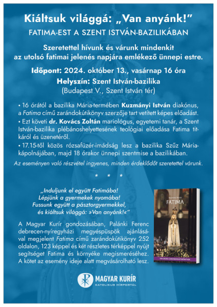 16 órától a bazilika Mária termében Kuzmányi István diakónus, a Fatima zarándokútikönyv szerzője tart vetített képes előadást. Ezt követi Kovács Zoltán mariológus, egyetemi tanár, a Szent István-bazilika plébánoshelyettesének teológiai előadása a portugáliai kegyhely titkáról és üzenetéről.