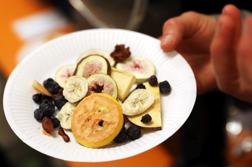 A pátyi Befogadás Háza másfél hektáron elterülő kertjében mintegy hetven gyümölcsfa terem, évről évre 100 kilogrammnál is nagyobb hozammal. Meggy, cseresznye, füge, alma, körte, ribizli helyben rendelkezésre áll, de mivel az első év a gép és a folyamat teszteléséről szólt, tartósítottak banánt, mangót, gyömbért, sárgadinnyét, áfonyát is, valamint kipróbálták a gomba, a paprika, a paradicsom, sőt, a húsvéti sonka liofilizálását is. „1 kilogramm sárgadinnyéből 110 gramm liofilizált dinnye lesz, 1 kilogramm füge a fagyasztás-vákuumozás után 60 gramm lesz. A gép kapacitása 3,5 kilogramm, terméktől függően átlagosan 3 liter körüli víz távozik. A kivont víz felhasználására még keressük a lehetőséget, hiszen az is igen értékes” – mondja a tervekre utalva Jakus Edina.