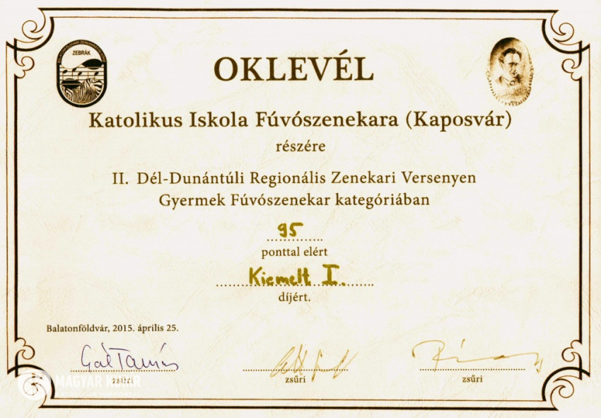 A kaposvári Nagyboldogasszony Római Katolikus Gimnázium, Általános Iskola és Alapfokú Művészeti Iskola Fúvószenekara Bogáthy Gábor karnagy vezetésével kiemelt első díjat ért el a versenyen, ami a zeneiskola tanárai áldozatos és kitartó munkájának is köszönhető. A maximális 100 pontból 95 pontot teljesítettek a kiváló zenekari hangzásnak és létszámuk emelkedésének köszönhetően. A diákok remekül együttműködtek a karnaggyal, amit az értékelésnél a zsűri is kiemelt. Különdíjat kapott Bogáthy Benedek virtuóz xilofonszólójáért.