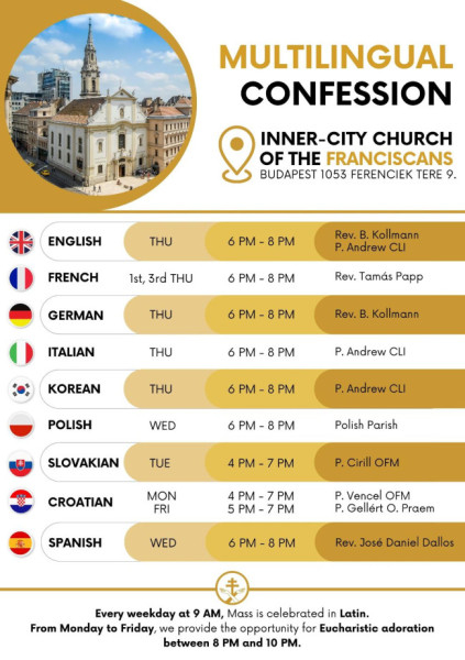 A Ferenciek terén álló Alkantarai Szent Péter-templomban a rendszeresen gyóntató papok közül sokan beszélnek idegen nyelveket; emellett a magyarul nem tudó külföldi vagy éppen magyarországi nemzetiségekhez tartozó hívek számára hetente-kéthetente rendszeres lehetőséget kínálnak szentgyónásuk elvégzésére.