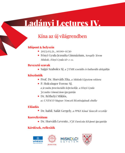 A Ladányi Lectures IV. a Jézus Társasága Magyarországi Rendtartománya és a Miskolci Egyetem közös rendezvénye, az UNESCO Magyar Nemzeti Bizottsága védnökségével. Ladányi László (1914–1990) jezsuita Kína-szakértőre három évtizeden át mint elsődleges, megbízható, naprakész hírforrásra figyelt a Kína iránt érdeklődő világ. A nevéhez köthető China News Analysis heti összefoglaló és A kínai kommunista párt és a marxizmus 1921–1985: Egy önarckép (London, 1988) kiadvány máig fontos forrás.