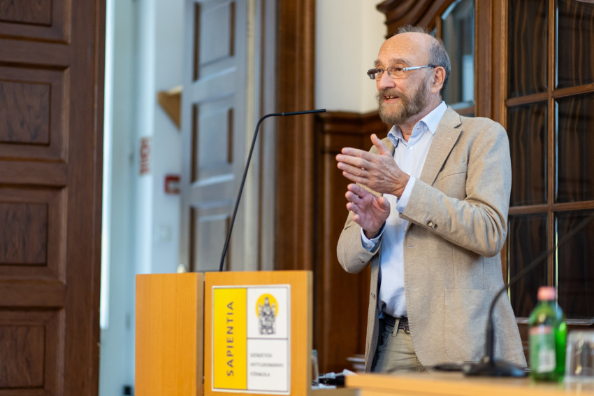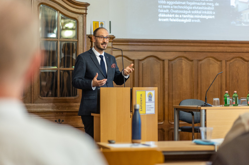 A rektor két szempontra hívta fel a figyelmet beszédében. Az egyik, hogy a tudásanyag általában szakterületekre van felparcellázva, a mesterséges intelligencia azonban minden irányból egyszerre ad ösztönzést a diákoknak, mintha egy régi polihisztoreszmény kelne benne életre. A másik, hogy a pedagógus tekintélyi szerepe radikálisan átalakul, már nincs meg a klasszikus aszimmetria, mert a mesterséges intelligencia bölcs és kompetens barát szerepébe bújva sajátos tekintélyi szerepet ad a diákoknak.
