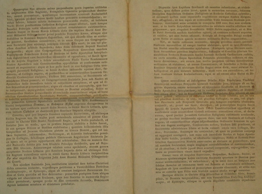 A nyomtatvány külön érdekessége, hogy azt a połocki jezsuita akadémia nyomdájában készítették. Połock (ma По́лацк, Fehéroroszország) ugyanis az 1773. évi feloszlatást követően a jezsuita rend központja lett, mivel II. Katalin orosz cárnő nem volt hajlandó betiltani a rend működését az Orosz Birodalom területén. A világ minden tájáról az itteni jezsuita akadémiára menekülő rendtagoknak köszönhetően az intézmény hihetetlen fejlődésnek indult, és kulturális-tudományos központtá is vált. Az Orosz Birodalom területéről 1820-ban, alig hat évvel a rend újjáindulását követően II. Katalin unokája, I. Sándor cár üldözte el a rendtagokat. Ám ez a hat év elegendő volt arra, hogy Európában a rend újjászerveződése megkezdődjék.