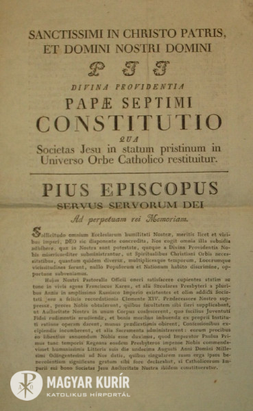 A magyarországi jezsuita provincia levéltárában a rend 1814. évi újjáindulásához kapcsolódó dokumentum bukkant elő. A VII. Pius által kiadott, a rendi működést újra engedélyező Sollicitudo omnium ecclesiarum kezdetű pápai bulla egy 1814/15 fordulóján, a fehéroroszországi Połock jezsuita akadémiáján nyomtatott példánya került elő Szittyay Dénes rendtörténész hagyatékából.