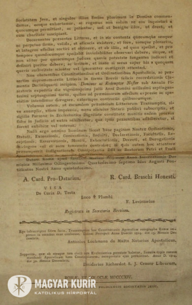 Az 1773. évi feloszlatást követően a Jézus Társasága 1853-ban tért csak vissza Magyarországra, így a rend 1814-ben történt újjáalakulásához kötődő dokumentumra aligha számíthattak a magyar rendtartomány levéltárában.