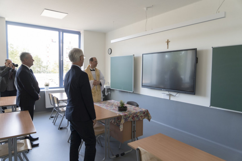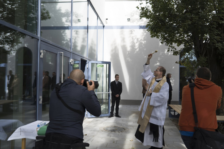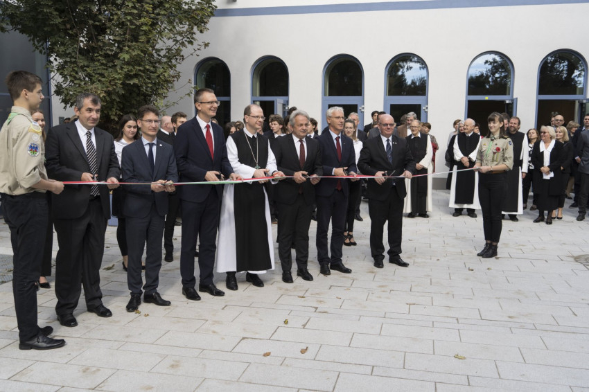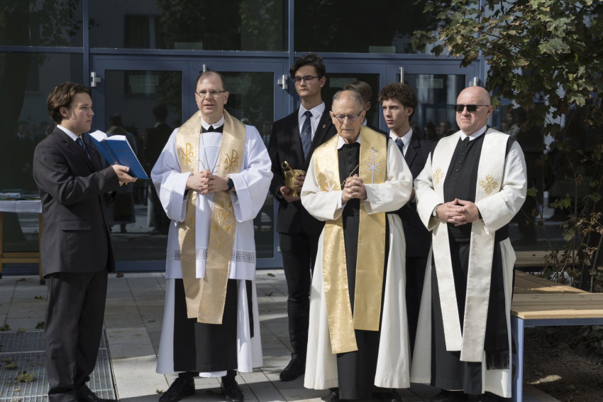 A köszöntők után a belső udvaron a nemzeti színű szalag átvágása után Bérczi Bernát O.Cist. zirci apát hálát adott a Gondviselőnek az elkészült épületért, majd ünnepélyesen megáldotta. Ezt követően Dékány Sixtus O.Cist. korábbi apáttal és Brückner Ákos Előd O.Cist. iskolai spirituálissal együtt szentelt vízzel meghintette az épület belső tereit, végül a vendégekkel bejárták az iskola új épületrészeit. A látványos, modern belső terek és az új, gumiborítású külső sportpálya is örömmel töltötte el a vendégeket és az iskola tanárait, akik már használatba is vehették ezeket.
