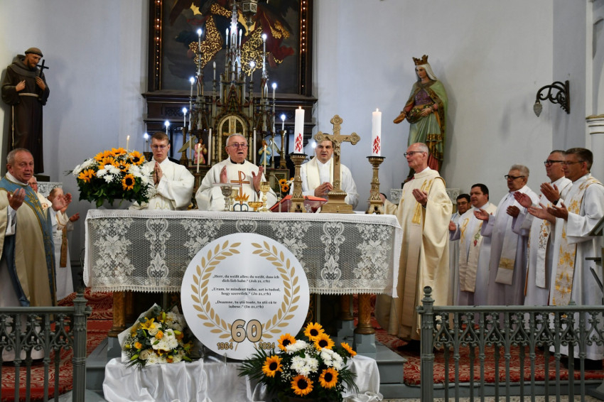 „Készen állunk az ünneplésre! Mindenkit örömmel várunk!” – jelent meg a meghívó május 25-én, szombaton a csáki plébánia közösségi oldalán, a feltöltött képeken és rövid videókon pedig egy ünneplőbe öltöztetett, a Szentszék zászlajának fehér-sárga színeiben pompázó, nyári virágokkal díszített templom volt látható. A főoltár előtt nagy méretű, kerek évfordulós lapon a 60-as szám és egy szentírási idézet volt olvasható: „Uram, te mindent tudsz, azt is tudod, hogy szeretlek.” (Jn 21,17b)